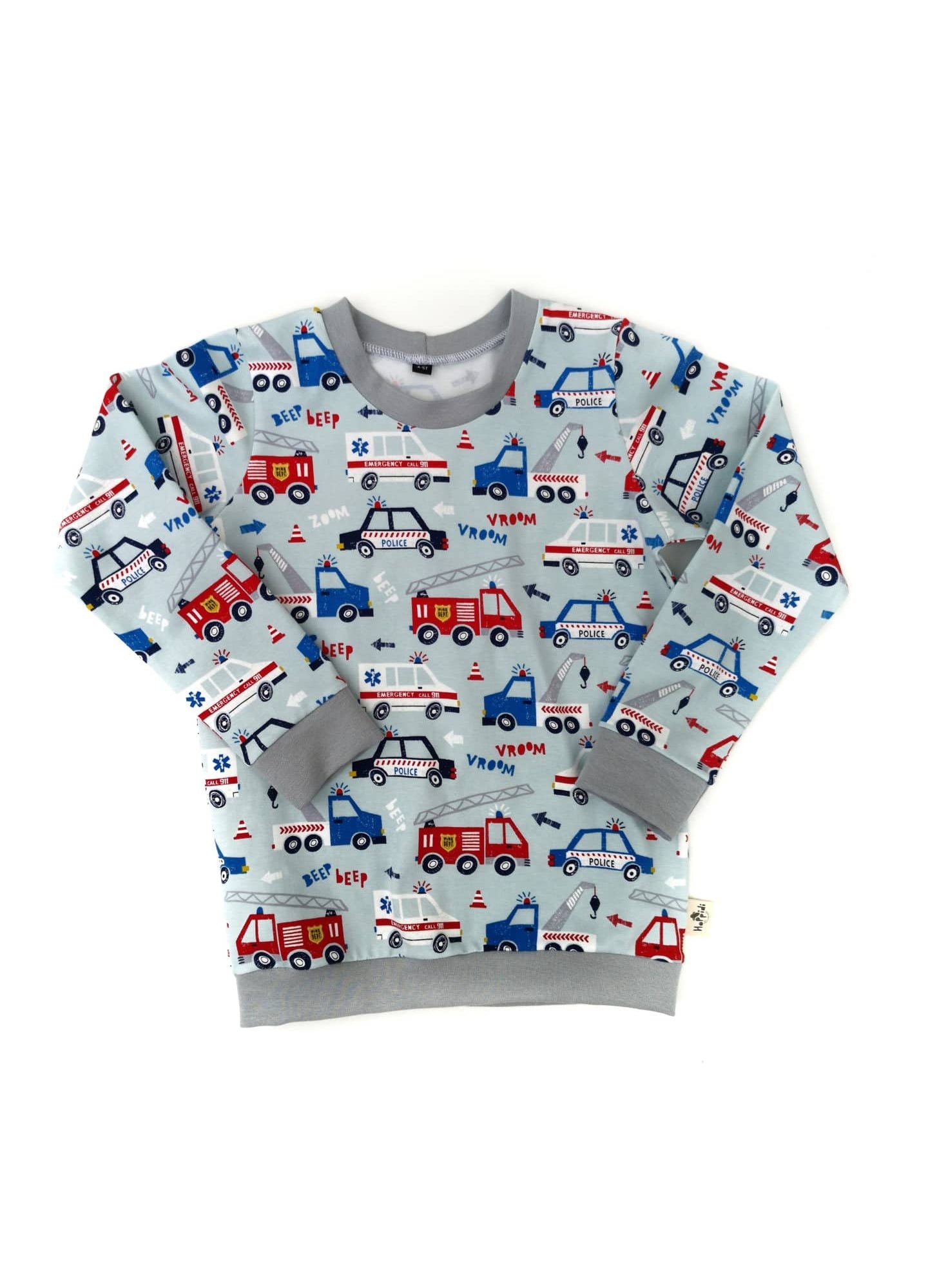 Cute emergency vehicles print featuring ambulance, police cars, fire engines, and tow...