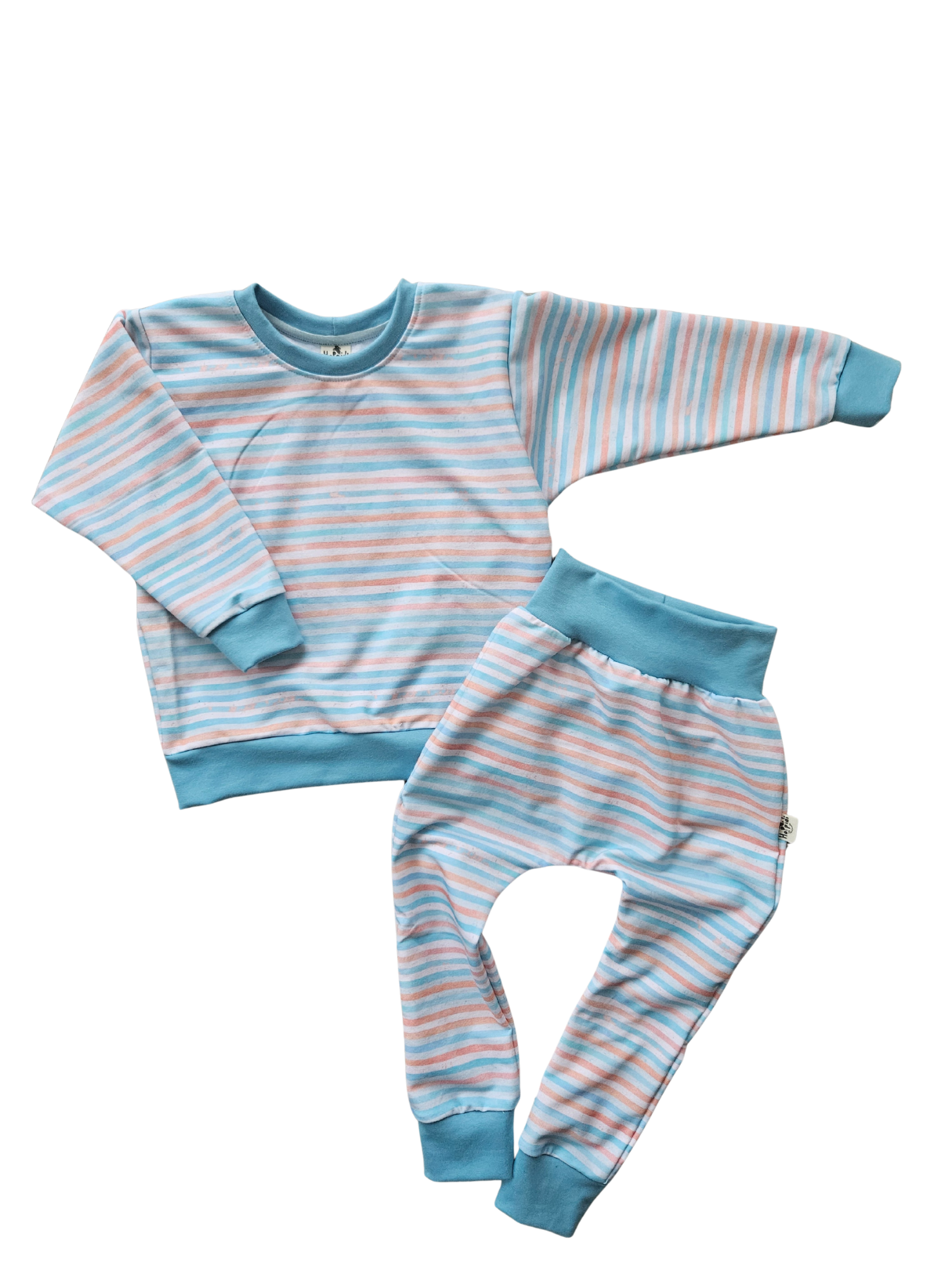 This comfortable lounge set consist of a relaxed fit sweatshirt and harem pants and is handmade with soft organic cotton French terry fabric. There are no nasty chemicals in it and the material is durable and incredibly soft on your little one's sensitive skin. This set makes great cozy home wear that could be used as pajamas as well.